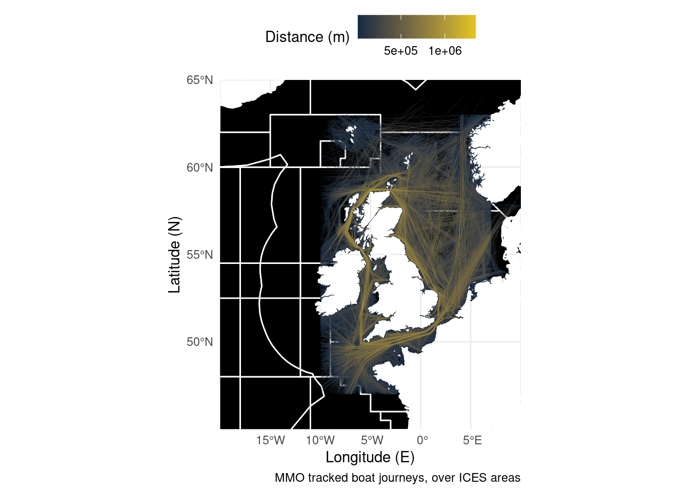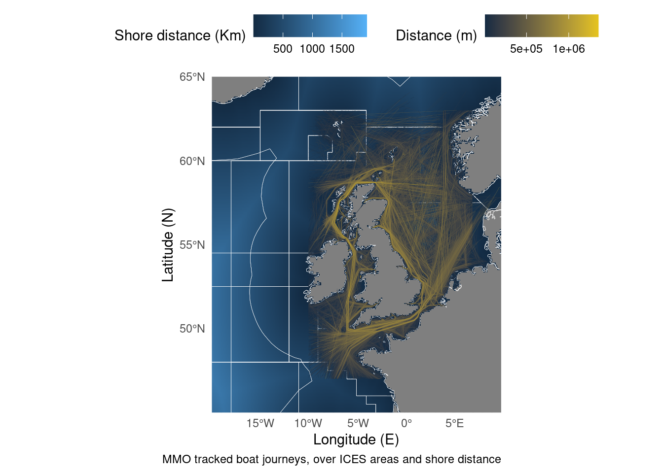 caption = "MMO tracked boat journeys, over ICES areas and shore distance",