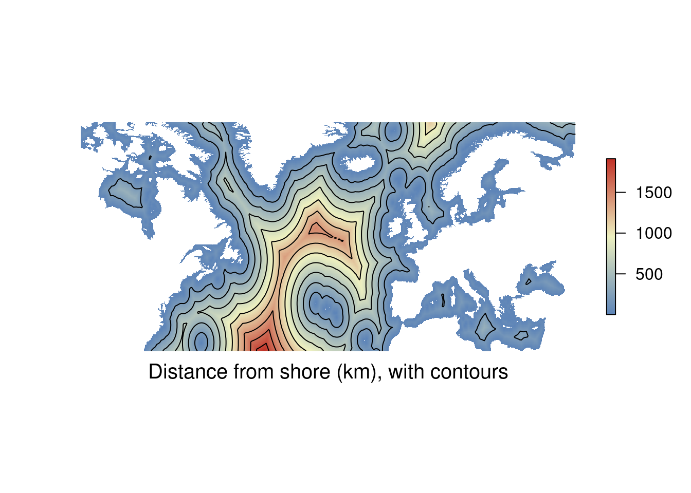 title(cex.sub = 1.25, sub = "Distance from shore (km), with contours", # Add labels