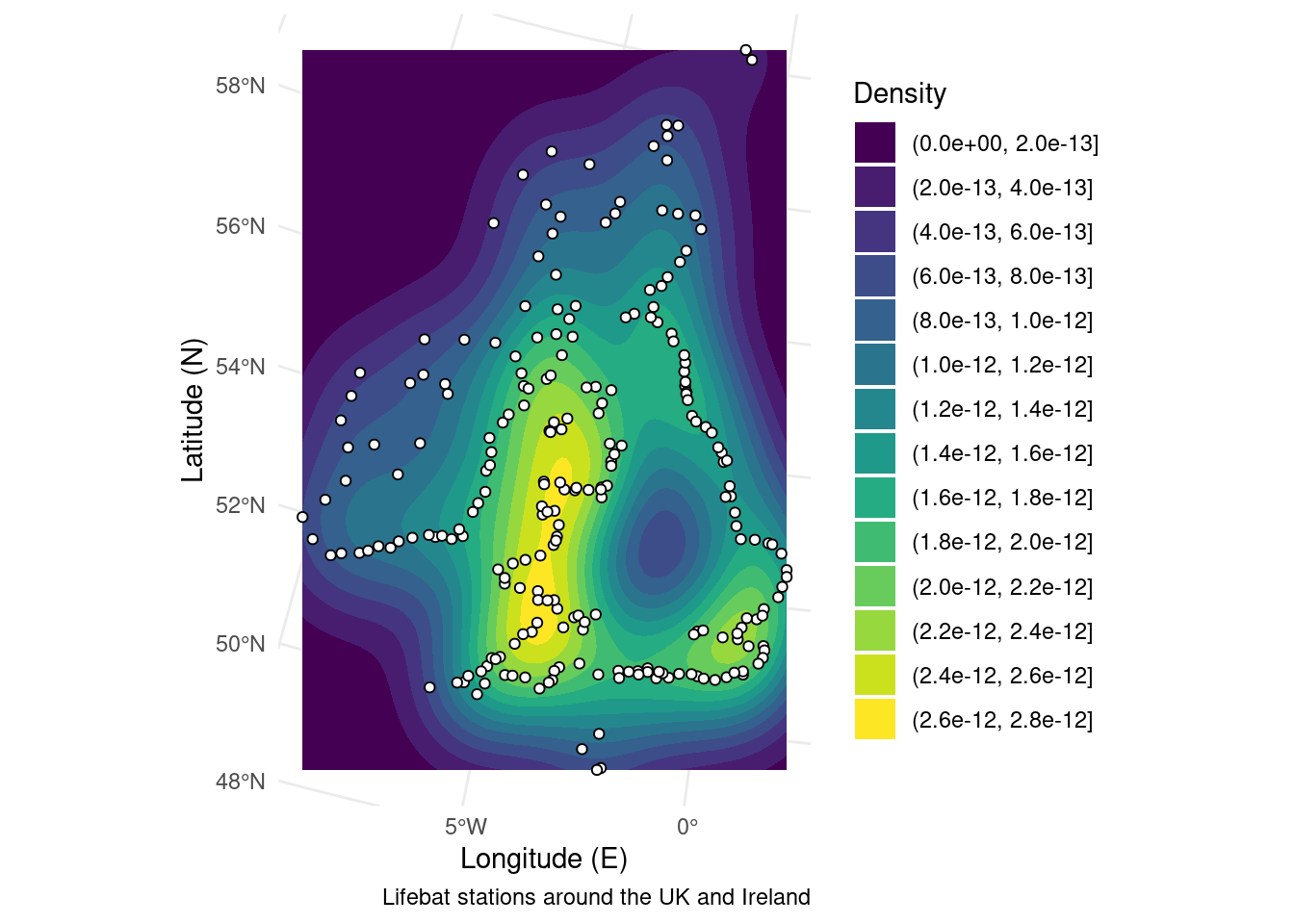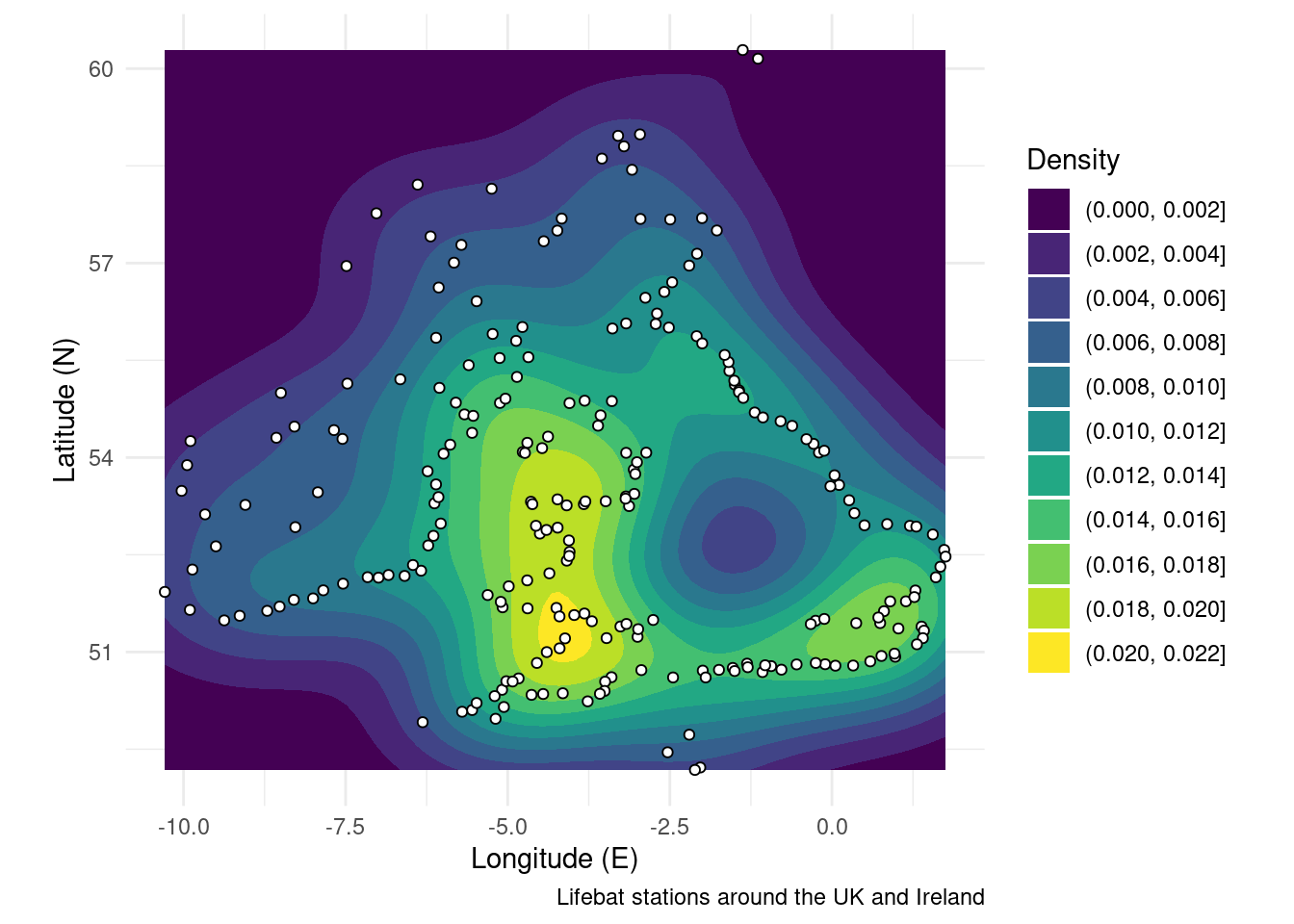 You can think of density maps as being closely related to contour plots. Really what you are doing is creating contours (filled = polygons, not filed = lines) of a density field. The density field will be a raster which has been computed from point data. So you can see how to get to a density map you need to move from points through multiple data types to get to the visualisation you’re after. The example below calculates the density of lifeboat stations.