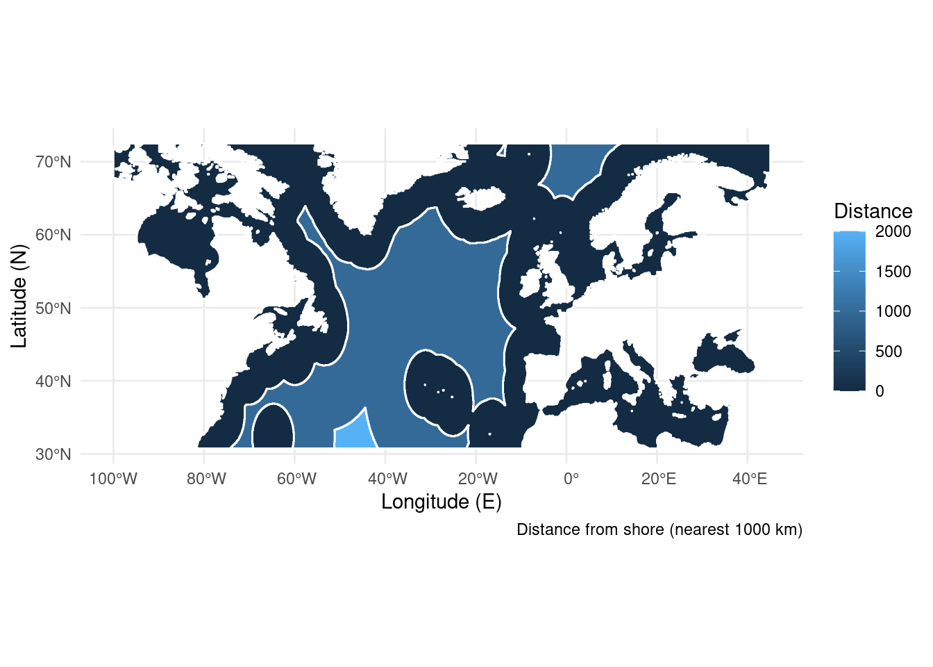 caption = "Distance from shore (nearest 1000 km)")